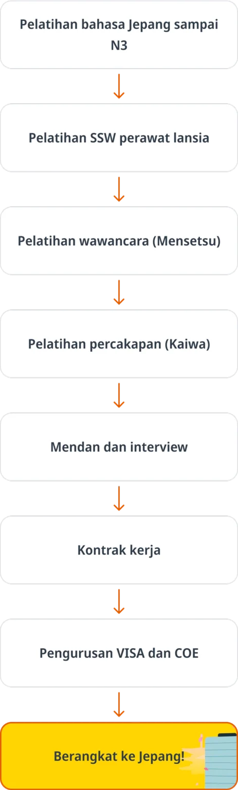Alur ini menjelaskan langkah-langkah yang perlu ditempuh untuk bekerja di bidang perawat lansia di Jepang melalui jalur Tokutei Ginou (Specified Skilled Worker)